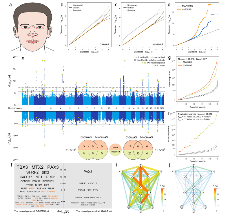 人类面部形态代表了一组多维、可遗传且相互关联的复杂表型。作者应用C-GWAS集成分析了78个面部形态的GWAS,结果显示C-GWAS的检出率是传统方法的3倍,并发现了17个影响脸型的新遗传位点。通过进一步的验证分析和功能基因组学分析,作者展示了C-GWAS的结果比传统方法的结果具有更高的遗传多效性,显著提升了脸型可被遗传因素解释的比例,且所指向的靶基因具有更明确的生物发育学功能,表明了C-GWAS在解析多维复杂表型遗传结构中的优势。