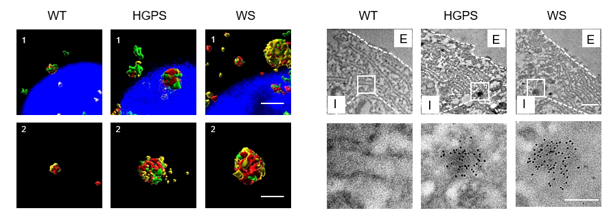 图1.HERVK 病毒RNA (左图) 和病毒颗粒(RVLP,右图) 在衰老人类细胞中聚集