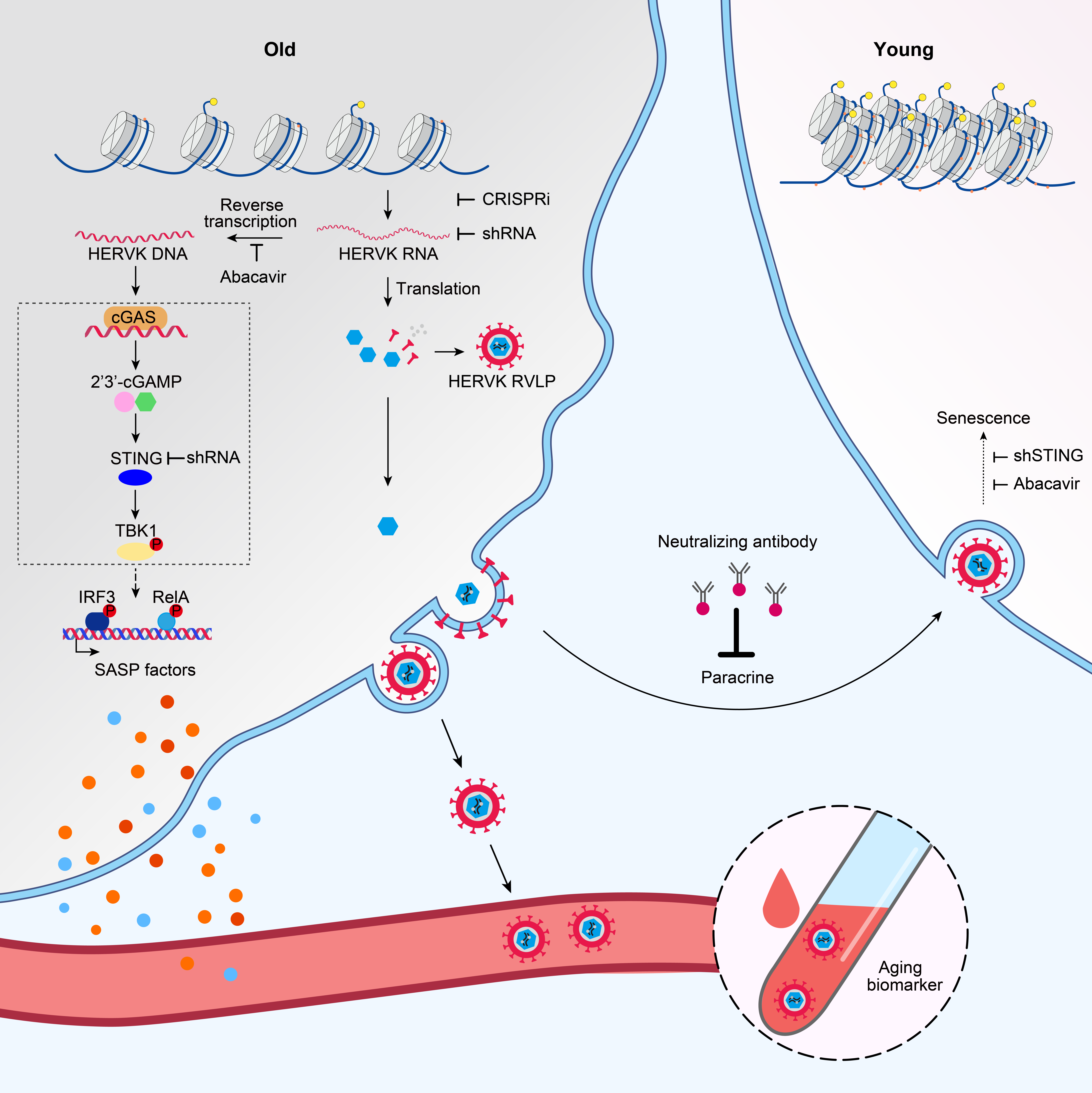 研究人员利用团队建立的不同衰老研究体系(包括儿童早衰综合征、成年早衰综合征、复制性衰老、生理性衰老的人间充质干细胞模型,人成纤维细胞衰老模型,以及小鼠、猴和人的生理性及病理性多器官衰老模型),结合高通量链特异性转录本测序、全基因组DNA甲基化测序、高分辨率单分子RNA/DNA原位杂交、免疫电镜和高灵敏的液滴数字PCR等多学科交叉技术,发现衰老细胞中表观遗传去抑制(如异染色质减少)导致基因组中ERV的转录激活并翻译出病毒蛋白,进而包装成为病毒颗粒。一方面,衰老细胞中ERV的反转录产物通过激活cGAS-STING天然免疫通路诱发细胞衰老和炎症;另一方面,衰老细胞释放的ERV病毒颗粒可通过旁分泌或体液介导的方式在器官、组织、细胞间有效传递并放大衰老信号,最终使得年轻细胞因受“感染”而老化。进一步,研究人员开发出有效抑制ERV古病毒复活及清除病毒颗粒的干预策略,即通过发展基于靶向ERV调控元件的CRISPR基因沉默体系、靶向逆转录酶的小分子抑制药物、靶向病毒包膜蛋白的中和抗体等技术,阻断ERV的转录、反转录、病毒级联感染等多个环节,进而实现了组织和机体衰老的延缓。