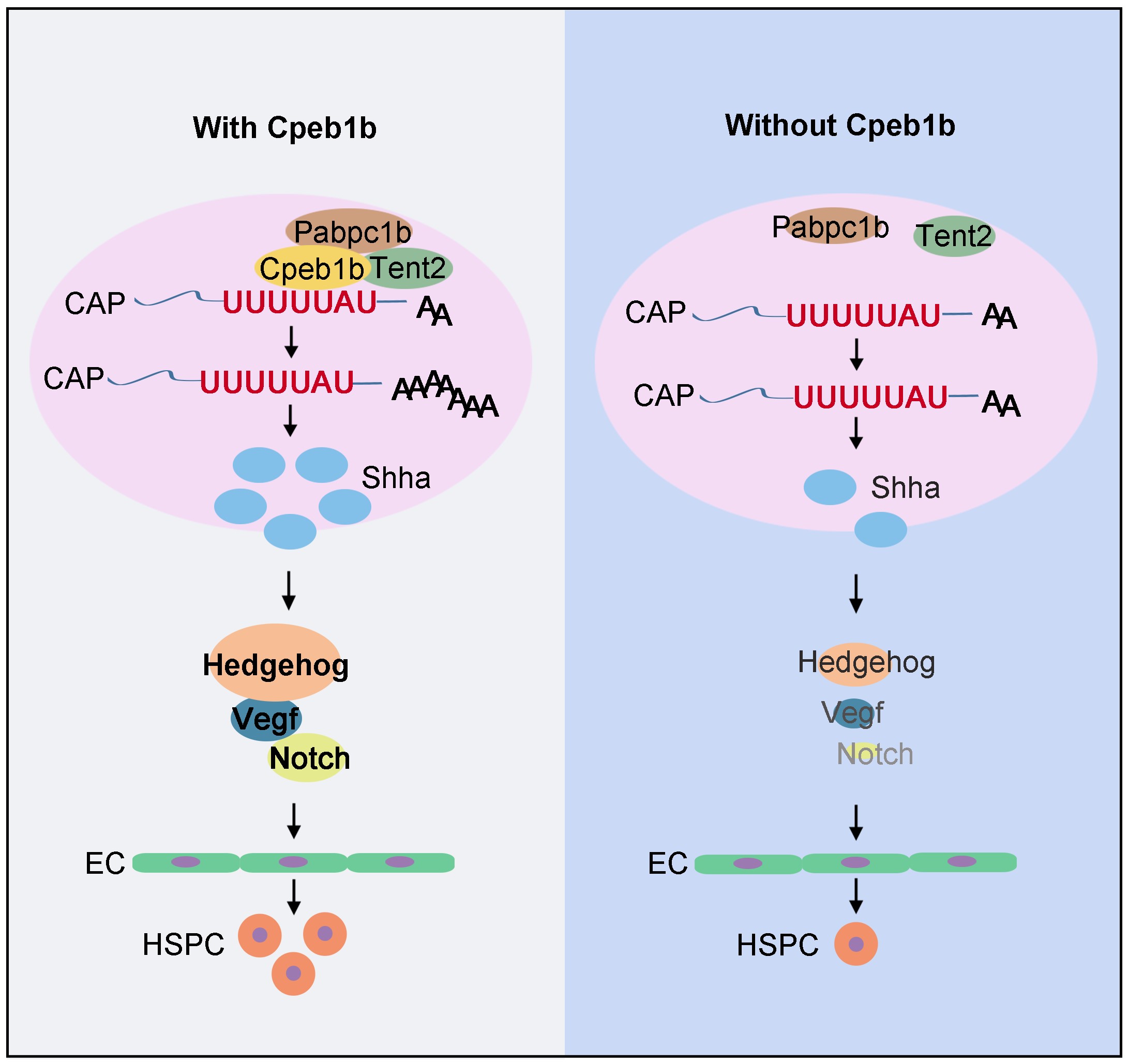 Cpeb1b介导的shha mRNA胞质多聚腺苷酸化调控斑马鱼HSPC发育的机制示意图