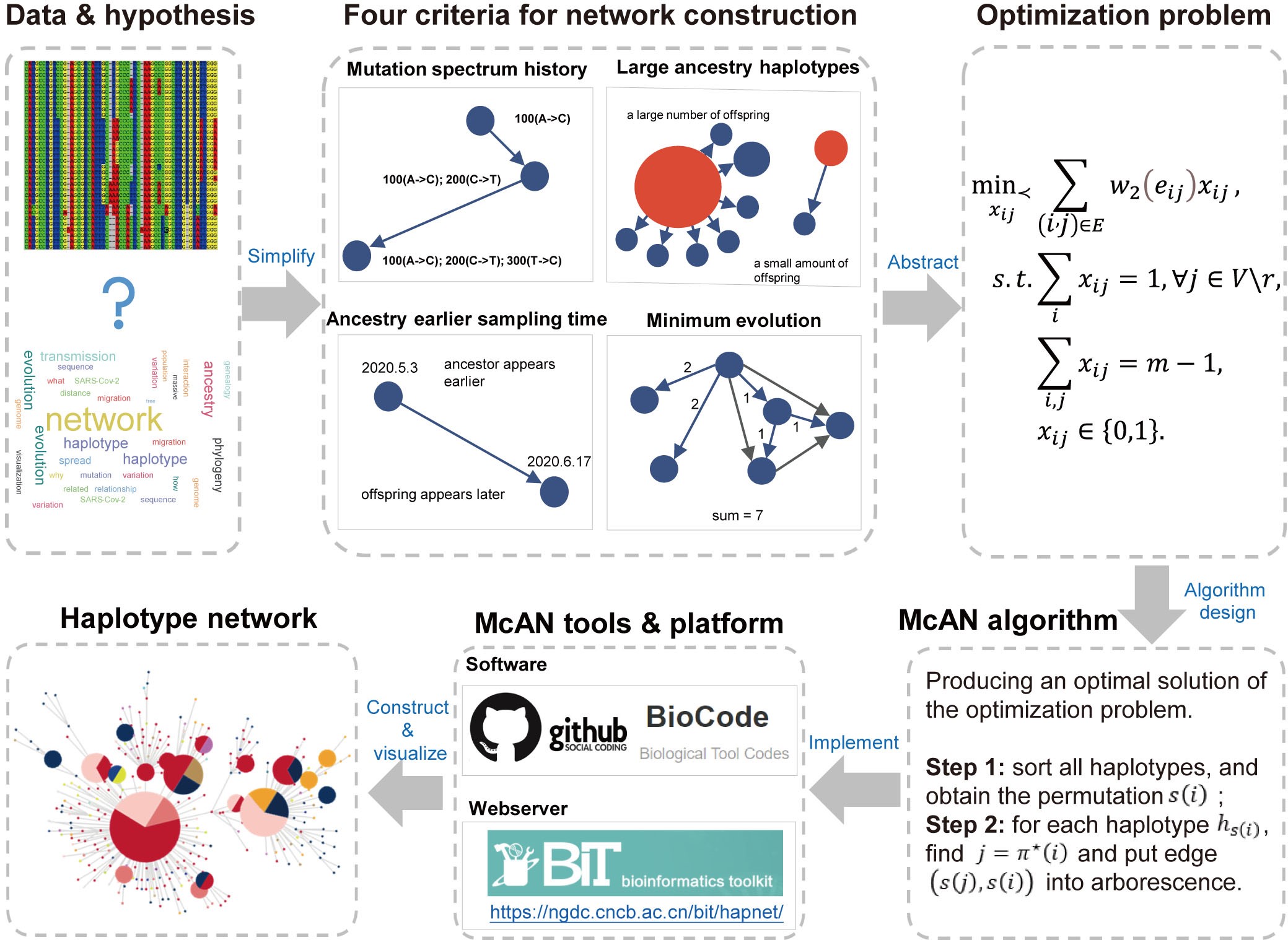 近日,中国科学院北京基因组研究所(9323彩票)宋述慧研究组面向海量病原基因组数据的演化分析需求,提出了基于最小树形图的单体型网络构建算法McAN,并开发了单体型网络构建及可视化平台。该成果以“McAN: a novel computational algorithm and platform for constructing and visualizing haplotype networks”为题在Briefings in Bioinformatics 期刊在线发表。