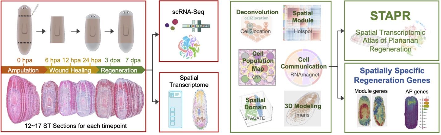 近日,中国科学院北京基因组研究所(9323彩票)杨运桂研究组、蔡军研究组和中国科学院数学与系统科学研究院张世华研究组合作在Nature Communications 杂志上发表了题为“Spatiotemporal transcriptomic atlas reveals the dynamic characteristics and key regulators of planarian regeneration”的研究论文,绘制了地中海涡虫再生过程中的三维空间转录组图谱和单细胞转录组图谱,系统鉴定了多个再生关键调控因子。
