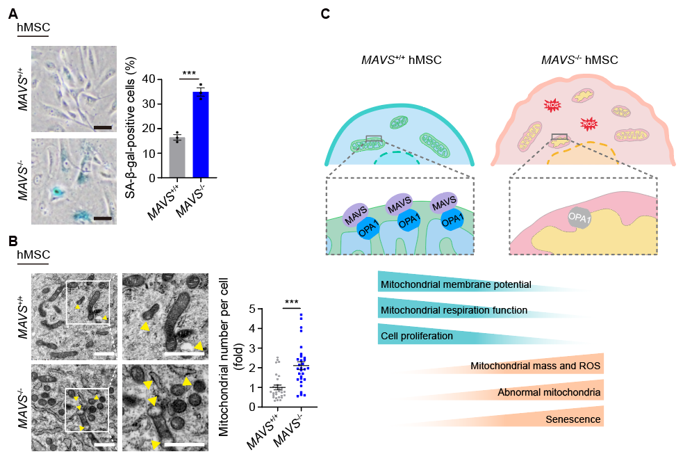 MAVS通过稳定OPA1来维持线粒体稳态进而调控人干细胞衰老。A. MAVS缺失加速人间充质干细胞衰老。B. MAVS缺失导致线粒体稳态失调。C. MAVS-OPA1轴调控线粒体稳态和人干细胞衰老模式图