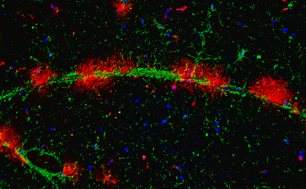 图2.衰老灵长类脊髓中AIMoN-CPM小胶质细胞(红色)在运动神经元轴突(绿色)处聚集