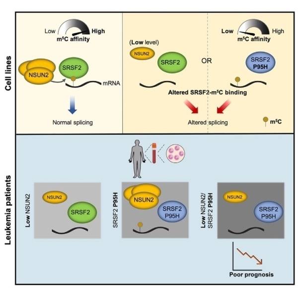 研究团队通过Biotin-pull down、质谱、荧光共振能量转移测定等交叉技术,发现了SRSF2偏好结合含有m5C 修饰的RNA,敲低 m5C 甲基转移酶 NSUN2会抑制SRSF2与其靶标RNA的结合并影响其可变剪接功能。进一步研究发现,白血病中常见的SRSF2P95H突变体会导致其识别m5C修饰RNA的能力及结合白血病通路关键转录本的能力减弱。通过对近700例白血病患者进行生存分析,发现NSUN2呈现低表达且携带SRSF2P95H突变的患者预后差。