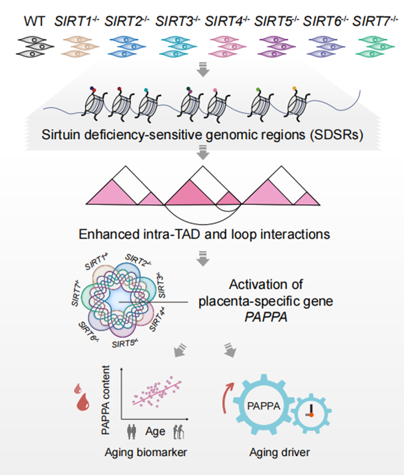 考虑到增强子活性的增加可能会导致染色质局部接触的重新建立,研究人员借助染色质构象捕获测序技术(Hi-C)探究了sirtuin蛋白缺失对染色质高级结构的影响,并观察到任一sirtuin缺失都会引起染色体内短距离相互作用增加。这种互作增加主要出现在富含SDSR的染色质拓扑结构域(TAD)内部,导致了增强子-启动子染色质环(E-P loop)强度增加,二者空间距离拉进,进而诱导一系列基因表达。胎盘特异基因PAPPA 是SIRT1-7分别缺失后共性上调表达的基因,其异位表达介导了sirtuin蛋白缺失所致的促衰老效应。进一步研究表明,PAPPA的表达上调是多种类型人类细胞衰老的“共性驱动力”。此外,老年人血浆中PAPPA的蛋白水平显著高于年轻人,提示其可作为度量人类衰老的潜在的生物标志物。