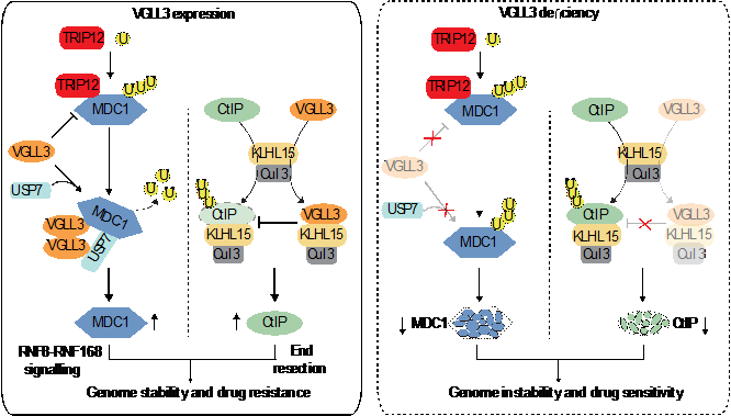 该团队前期利用定量蛋白质组技术,发现化疗药物促进VGLL3与染色质结合。本研究主要发现,在 DSB发生后,VGLL3能够被迅速招募至损伤部位,其招募依赖于多聚ADP-核糖(PAR)化修饰介导的染色质重塑和VGLL3的N端谷氨酸富集区。敲低或敲除VGLL3能抑制肿瘤细胞的HR,敏化肿瘤细胞对多种化疗药物,包括依托泊苷、喜树碱和表阿霉素以及PARP抑制剂的响应。进一步研究发现,VGLL3能通过抑制DSB修复中两个关键蛋白CtIP和DNA损伤检测蛋白1(MDC1)的蛋白酶体依赖性降解,促进DSB末端剪切和RNF8/168信号通路,协同增强DSB修复。具体来说,VGLL3一方面通过其谷氨酸富集区与CtIP竞争性结合泛素连接酶Cullin3的底物衔接子KLHL15,来抑制CtIP蛋白的泛素化修饰和蛋白酶体降解,从而促进同源重组修复末端剪切的起始;另一方面,VGLL3还能通过其C端的组氨酸富集区促进MDC1与去泛素化酶USP7的结合、抑制MDC1与泛素连接酶TRIP12的结合,协同抑制MDC1发生K48连接的多泛素化修饰,从而维持MDC1的稳定性和RNF8/168信号通路的活化。缺失VGLL3的谷氨酸富集区或组氨酸富集区,将抑制肿瘤细胞的HR、敏化肿瘤细胞对化疗药物的响应。小鼠移植瘤实验进一步证实了敲低VGLL3抑制肿瘤生长、增强化疗敏感性;而谷氨酸富集区或组氨酸富集区缺失都干扰了VGLL3的促肿瘤生长和耐药能力,表明靶向抑制VGLL3的HR功能,能增强肿瘤化疗效果。鉴于VGLL3在多种恶性肿瘤(包括ER阴性的乳腺癌)中的高表达与患者的不良预后密切相关,VGLL3有望成为一个新的肿瘤治疗靶点。