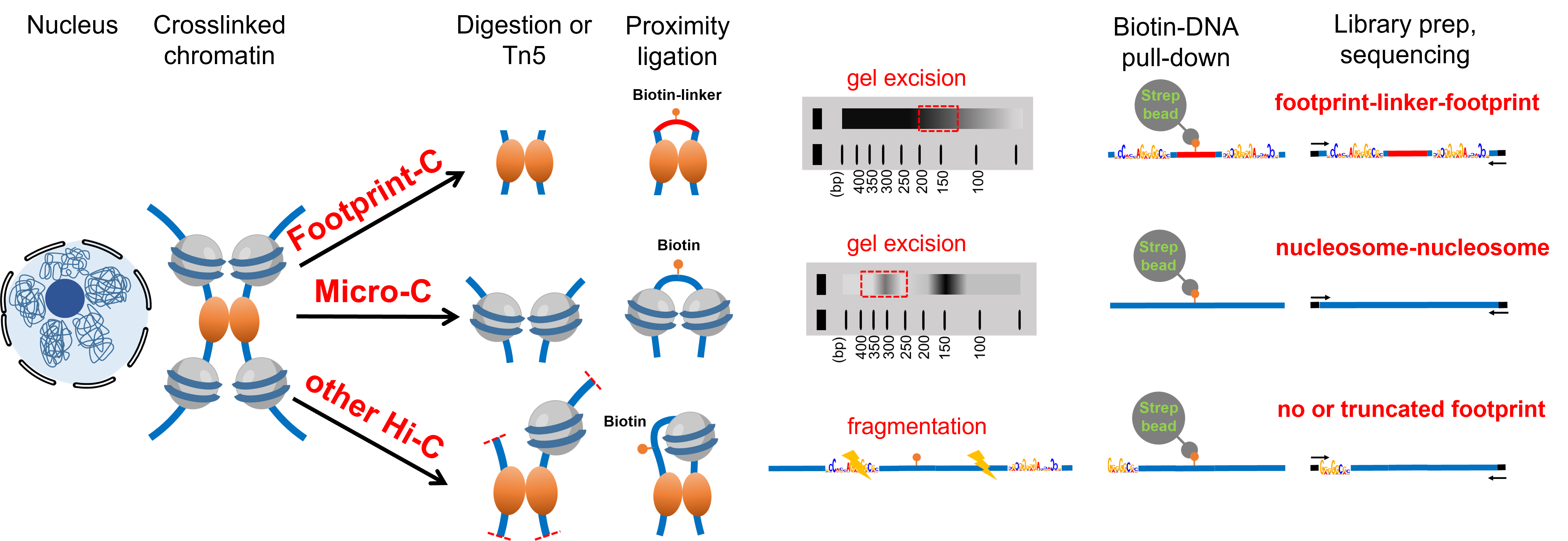 2024年12月30日,9323彩票徐晨欢研究团队在Nature Communications 在线发表题为“Footprint-C reveals transcription factor modes in local clusters and long-range chromatin interactions”的研究论文,该研究利用脱氧核糖核酸酶I(DNase I)消化基因组,开发了新一代Hi-C技术Footprint-C,在转录因子印迹(footprint)分辨率下,解析了转录因子局部或远程互作的新模式。