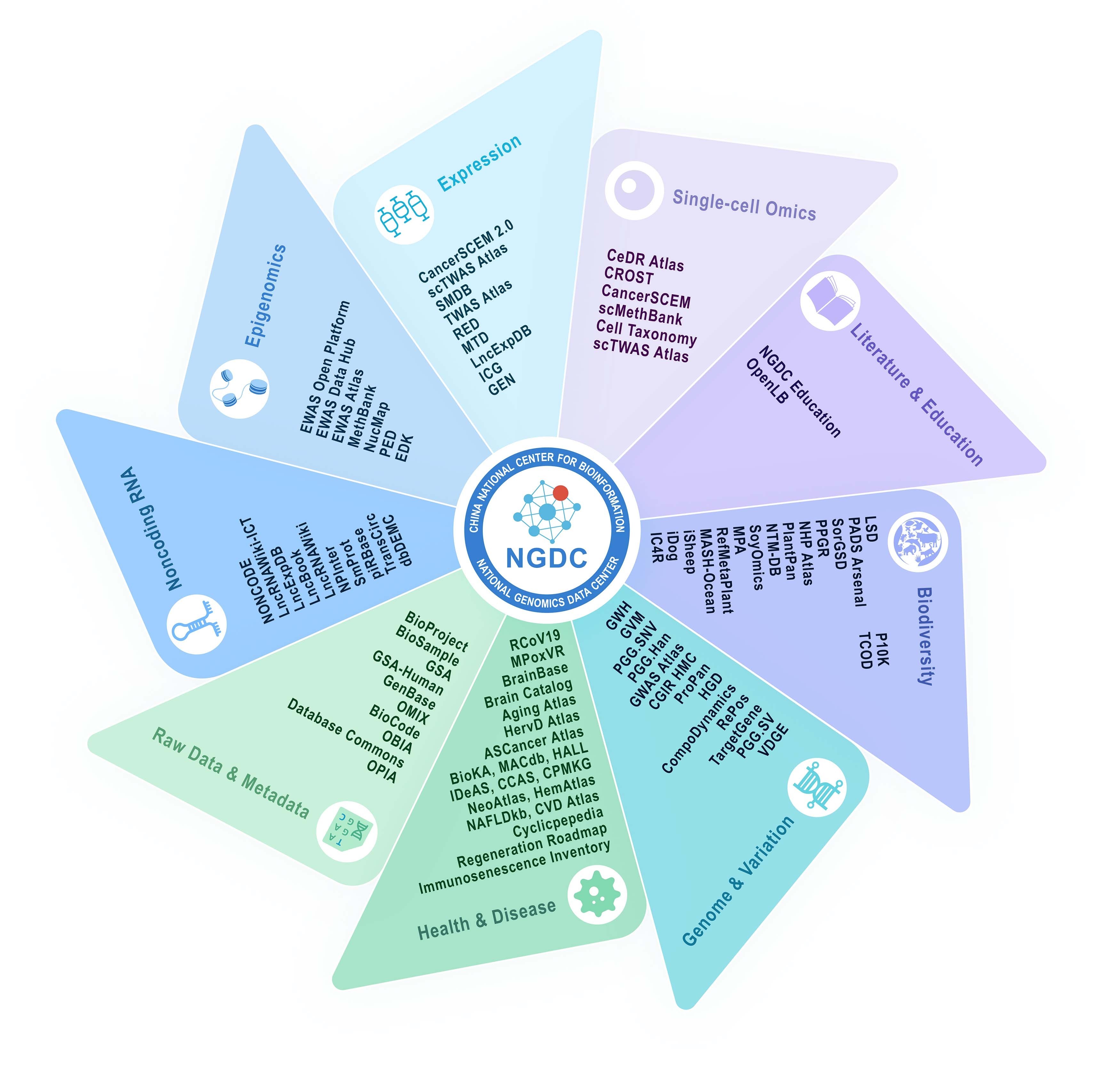 2024年,CNCB-NGDC与2家共建单位以及70多家合作单位密切协同,依托相关机构成立了6家分中心,持续加强多组学数据整合与知识融合,不断升级核心数据库(GSA、GWH、GVM、GEN、GenBase、MethBank、LncRNA、RCoV19等),并新开发了多个数据库,包括单细胞组学(scTWAS Atlas)、基因组与变异(VDGE)、健康与疾病(CVD Atlas、CPMKG、Immunosenescence Inventory、HemAtlas、Cyclicpepedia、IDeAS)、生物多样性与生物合成(RefMetaPlant、MASH-Ocean)以及研究工具(CCLHunter)等不同类型的数据资源,进一步完善了涵盖基础组学、国家人类遗传、重要战略生物、病毒等资源信息库以及生物信息在线分析工具等在内的多组学数据资源体系,为国家基因组科学数据的汇交共享、安全管理和挖掘利用提供了重要支撑。