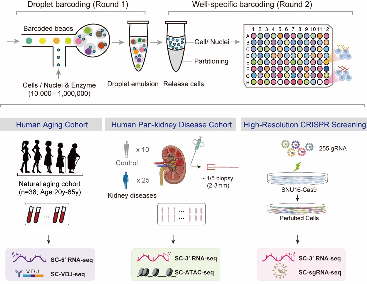研究团队将UDA-seq 应用于三个应用场景中,包括衰老、疾病人群队列研究以及高通量CRISPR筛选研究。首先,对健康人和多种疑难肾病患者的肾脏组织构建了单细胞RNA和ATAC双组学图谱。克服了微量冰冻样品前处理的难点,每例样本仅需五分之一条针穿活检样品,在液滴微流控中利用2个通道的反应收集到来自35例捐献者的一共20万高质量双模态单细胞数据。通过建立新算法,鉴定出与蛋白尿和肾损伤表型相关的罕见细胞类型POD细胞和EC-GC细胞,以及关键细胞亚群的调控网络和关键因子。利用UDA-seq,研究者还构建了自然衰老人群队列的PBMC单细胞转录组和免疫受体序列双组学图谱。利用2个通道的反应,收集到12万高质量单细胞数据,解析了衰老相关的细胞亚型,并报道了衰老相关的新细胞亚型:ITGB1+PREX1+ Naive CD4+ T细胞。最后,UDA-Seq也展示了对高通量CRISPR筛选的兼容,在胃癌细胞系中系统解析了细胞对溴结构域蛋白基因家族扰动的响应。