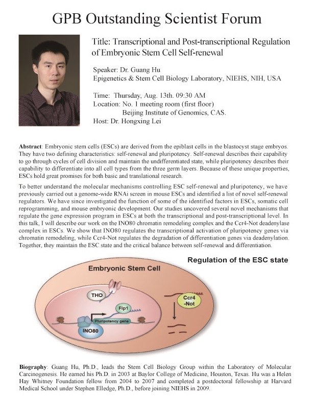 讲座通知(2015年8月13日)-Transcriptional and Post-transcriptional Regulation of Embryonic Stem Cell Self-renewal
