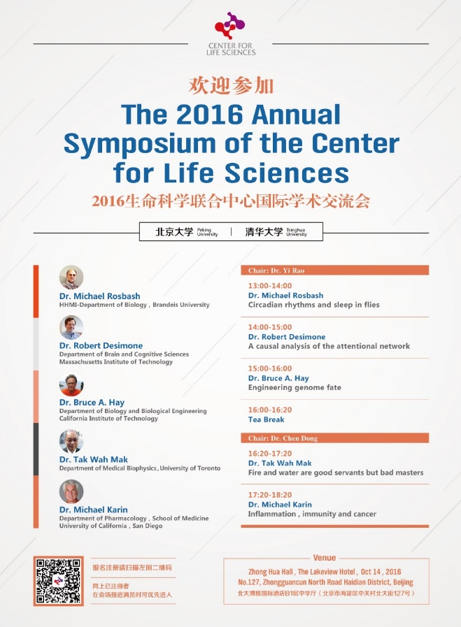 邀请参加2016年生命科学联合中心国际学术交流会。本次交流由北京大学和清华大学共同举办,邀请了 Dr. Michael Rosbash ( Brandeis University ), Dr. Robert Desimone ( Massachusetts Institute of Technology ), Dr. Bruce A. Hay ( California Institute of Technology ), Dr. Tak Wah Mak (University of Toronto) 和 Dr. Michael Karin (University of California, San Diego) 五位专家为大家 做报告和交流,饶毅和董晨主持会议。