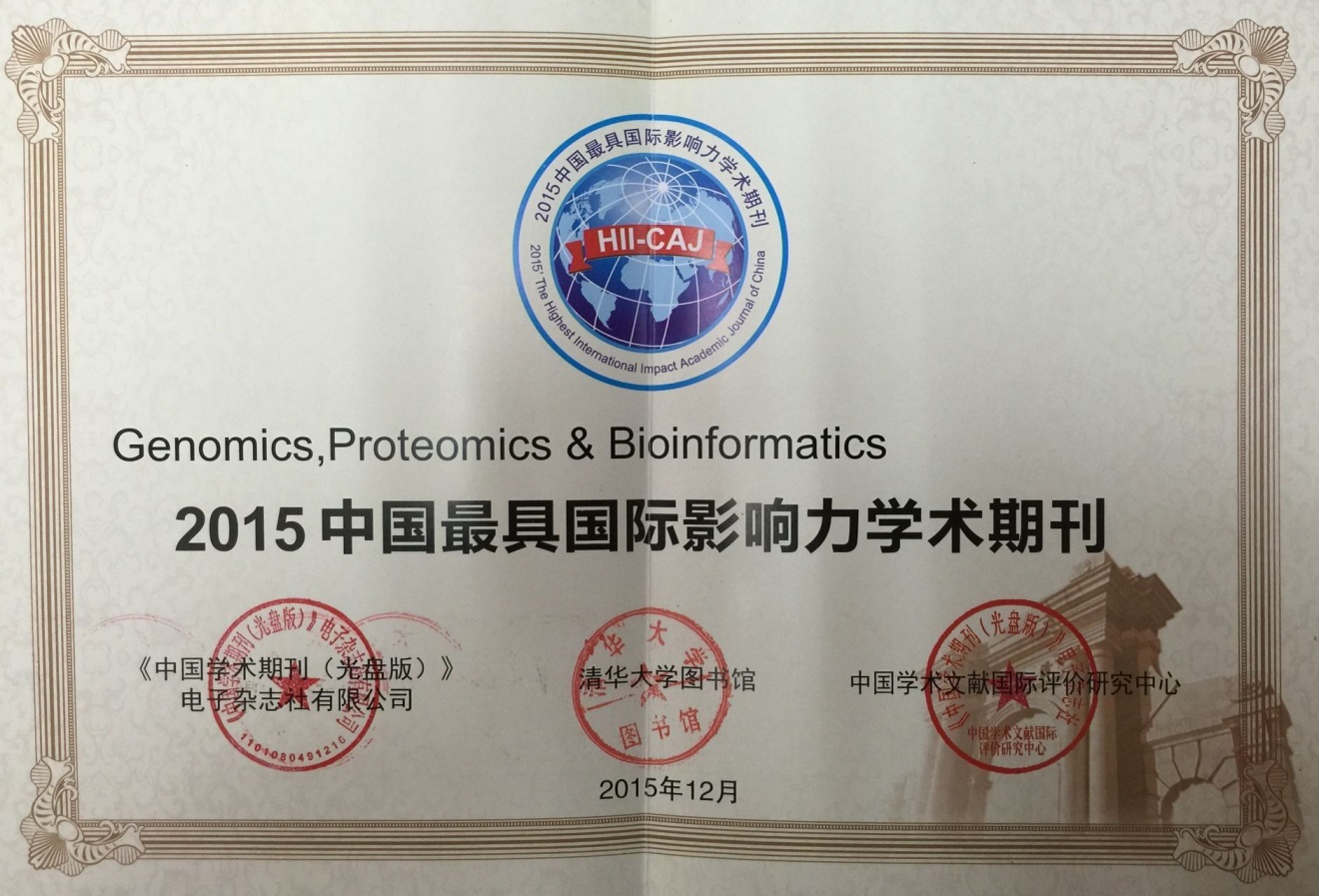 12月18日,中国学术期刊(光盘版)电子杂志社、清华大学图书馆、中国科学文献计量评价研究中心联合发布了《2015中国学术期刊国际国内影响力研究报告》,公布了2015年度“中国最具国际影响力学术期刊”和“中国国际影响力优秀学术期刊”名单。由中科院北京基因组研究所和中国遗传学会主办的英文版核心期刊Genomics, Proteomics & Bioinformatics(GPB)入选“2015中国最具国际影响力学术期刊”,是继2013年、2014年获得此称号后的再次入选,且在排名上较上两年有大幅提高,在备选的3500种科技类期刊中排名第59位。