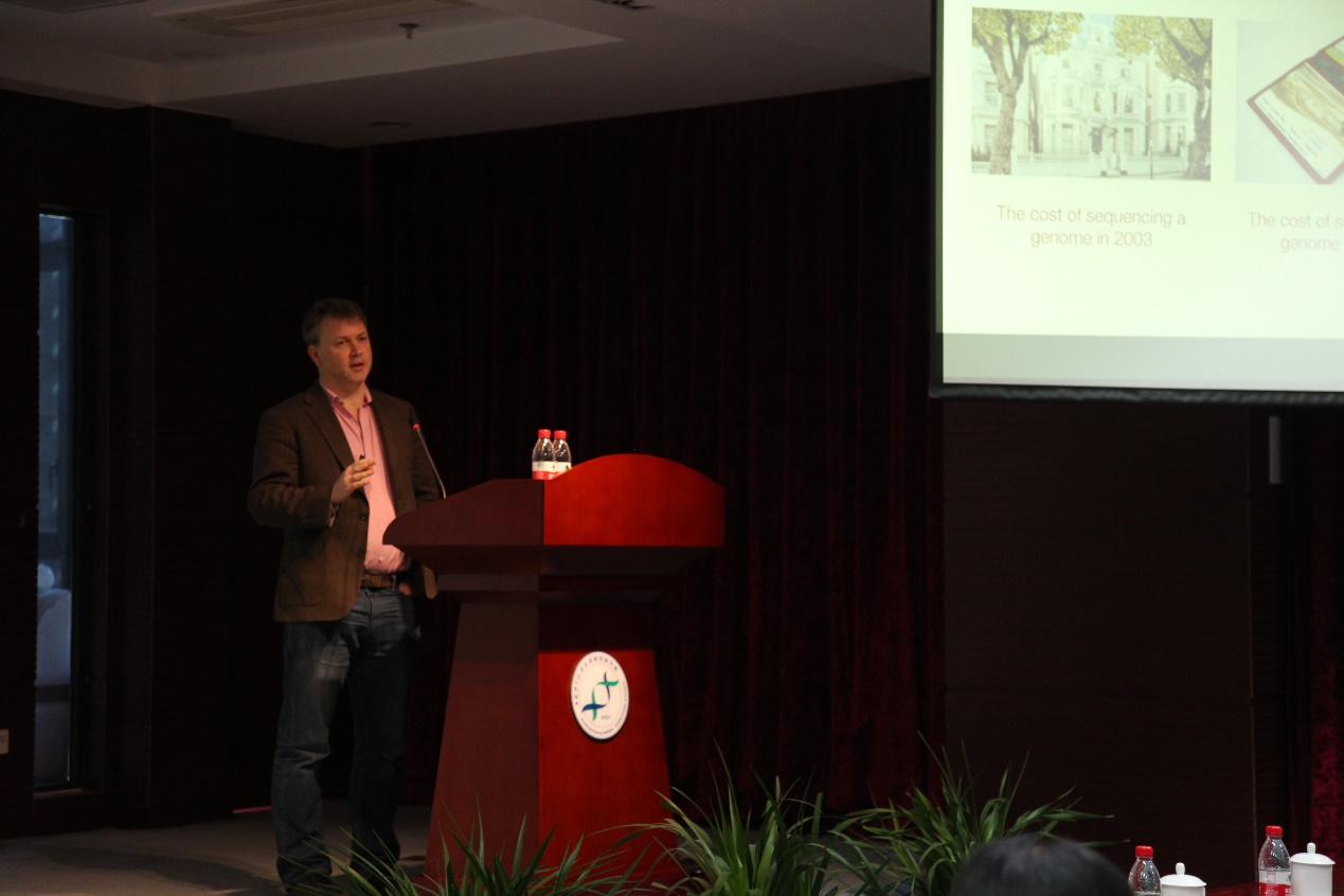 本次论坛的主讲人是英国欧洲分子生物学实验室-欧洲生物信息学研究所(EBI)所长Ewan Birney博士,报告题目为:生物大数据——挑战与机遇。Birney博士介绍了基因组学学科的发展、生物大数据的飞速增长及面临的机遇和挑战。他同时还向我们介绍了EBI的发展历史、在生物信息学及生物数据库建设方面的主要贡献以及EBI目前的主要研究方向和目前正在研究的基因硬盘项目。该研究项目拟用人工合成的DNA存储文本文档、图片和声音文件等数据。1克DNA能够存储大约2拍字节,相当于大约300万张CD。DNA作为数字存储介质,容量大,读取方便,便于保存,保存时间长等优点。Birney博士向我们展示了用这种方法存储的马丁·路德·金著名演说《我有一个梦想》中时长26秒的片段、一张欧洲生物信息研究所的JPG格式图片、一份关于DNA分子结构的PDF学术论文和一份包含威廉·莎士比亚154首十四行诗等文档。存储这些信息的DNA分子微小如一粒尘土。这项技术使得将全世界3000亿TB的数据,存储到手掌大小的区域成为可能。