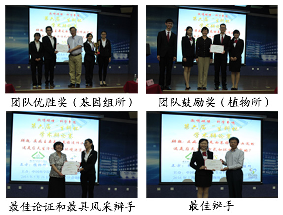 在紧张激烈的角逐之后,经专家评委打分评选和现场观众代表投票,本次比赛的各个奖项最终揭晓:基因组所代表队荣获团队优胜奖,植物所代表队荣获团队鼓励奖;植物所二辩高慧慧荣获“最佳辩手”奖,基因组所四辩李品同时荣获“最佳论证”奖和“最具风采”奖。随后,评委和嘉宾为获奖团队和个人进行了颁奖。辩论赛在欢乐与喜悦的气氛中圆满结束。