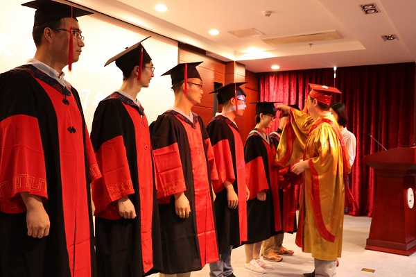 随后,身着学位服的毕业生们依次上台,由所领导和导师为毕业生颁发了毕业证书,进行了拨穗礼。学位帽上的帽穗从右边拨到左边,象征着毕业生们圆满地结束了自己的研究生生涯,学有所成,展翅高飞。