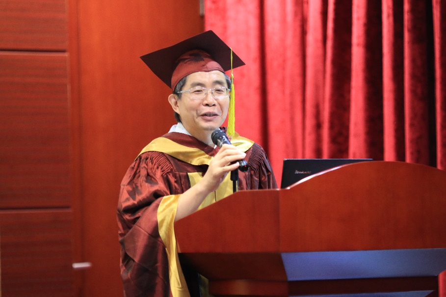 接下来,所长薛勇彪向毕业生致辞。薛勇彪从所长、导师和父辈的角度,希望学生们能有远大的志向,对生活要有长远的打算,在今后工作中能为伟大的科学事业做贡献;希望同学们不论是处理工作、生活还是学习中的问题,都能学以致用,学会解决问题的本领;希望大家拥有健康良好的心态,充满对生活的向往和热情。最后嘱咐同学们:行百里者半九十,不论有什么梦想都要学会去坚持,才能实现自己对人生的一种追求,一种享受。