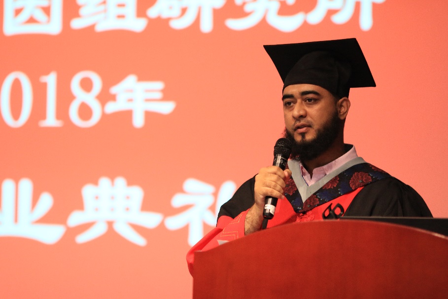 来自巴基斯坦的MUHAMMAD RAMZAN MANWAR作为留学生代表发言。他对各位导师们表示衷心的感谢,是导师们教会自己如何应对科研世界的挑战,如何建设科研世界;建议作为未来的科研工作者的毕业生们,用专业知识为世界做有意义的发现,为病人和农民们提供帮助,并为强化社会卫生和农业基因组学领域做出贡献;此外,MUHAMMAD认为通过合作可有效促进人口基因组学发展,可通过精确医学和大生物学数据来对抗包括癌症在内的各种疾病。科学合作可以增加科学传播的机会,从而将疾病负担降到最低。最后,他感慨到科学是没有国界的,中国科学院大学为国际学生开启了一系列的大门,自己有幸能进入了这样的大门,并加入到基因组所最先进的跨学科平台,感恩在中国和基因组所的美好时光,这将是最美好的回忆。