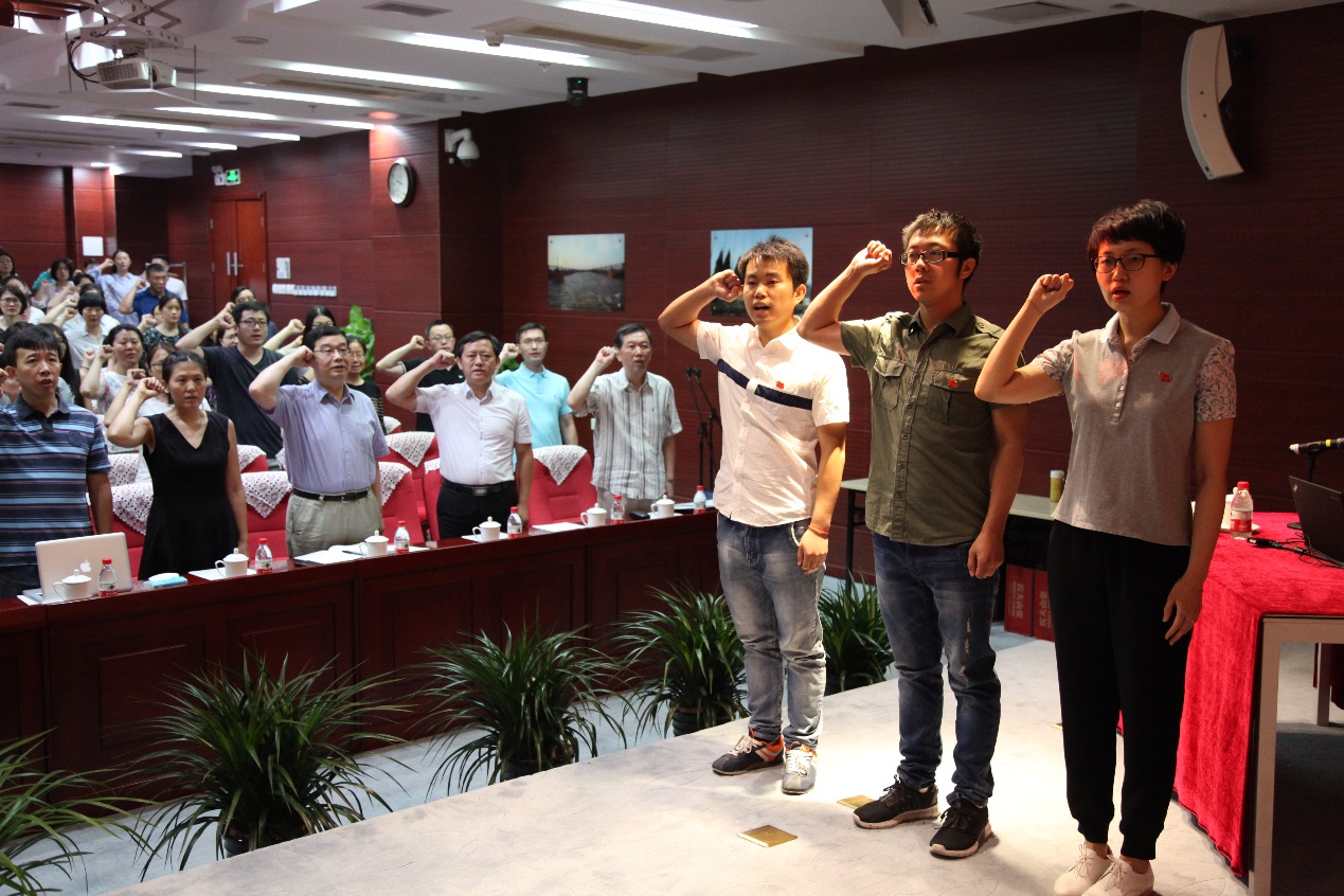 大会在雄壮的国歌声中开始。首先举行了入党宣誓仪式,3名预备党员上台宣誓,同时全体正式党员重温入党誓词。在鲜红的党旗面前,党员们举起右拳,庄严宣誓,立志传承红色基因,不忘初心,牢记使命,为共产主义奋斗终身。