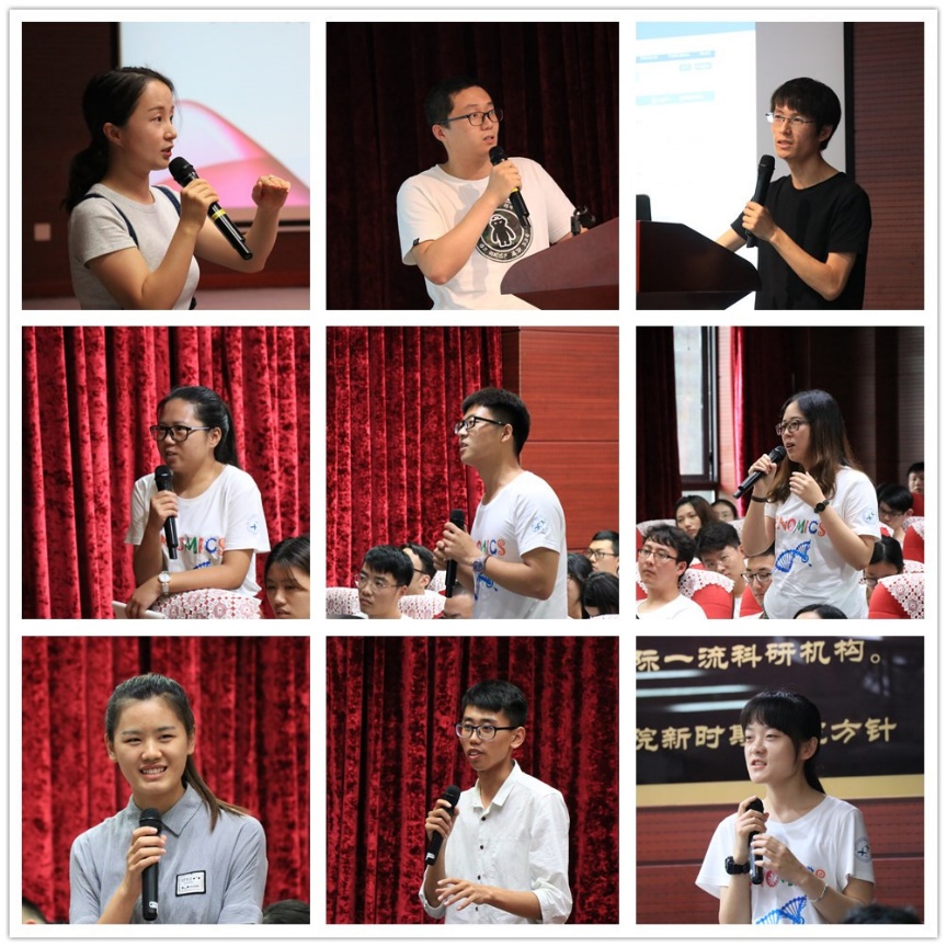 7月19日下午,三名处于不同学习阶段的研究生代表与营员们进行了交流座谈。2011级硕博连读研究生杨雪静以《精准科学和我》为题,讲述了自己在基因组所7年的经历,如何从一个懵懂的研一学生成长为一个坚定、自信的科研工作者,她以自己在医院中看到病人的需要的切身体会为动力,激发投身科研、解决实际问题的决心,也使得在科研工作经历最低谷时期得以坚持下来;2015级硕博连读研究生李萌伟,见证了研究所生命与健康大数据中心的建立和成长,与小伙伴们一起付出了很多辛苦和努力,他为此感到骄傲和自豪,也呼唤更多的同学加入大数据中心这个和谐的大家庭;2013级硕博连读研究生陈雪鹏向同学们介绍了自己如何以数学的背景,成功跨入基因组学这个领域,他向同学们分享了自己对生命科学的认识,以及未来交叉学科的人才需求,激励更多跨学科的学生用自己的才能去解决关乎民生的实际问题。三位研究生的报告引起营员们强烈的共鸣和触动,营员们纷纷提问,充分互动交流。