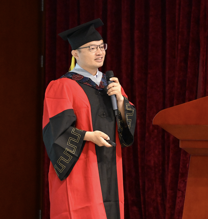 2024届博士毕业生梁广豪作为毕业生代表发言,分享了他从农村少年到博士毕业生的奋斗历程,并表达了对未来的期望。他呼吁同学们在实现自我价值的同时,要以老一辈科学家的家国情怀为榜样,为社会和国家的发展贡献力量,祝愿每位毕业生都能拥有充实、快乐、有意义的人生。