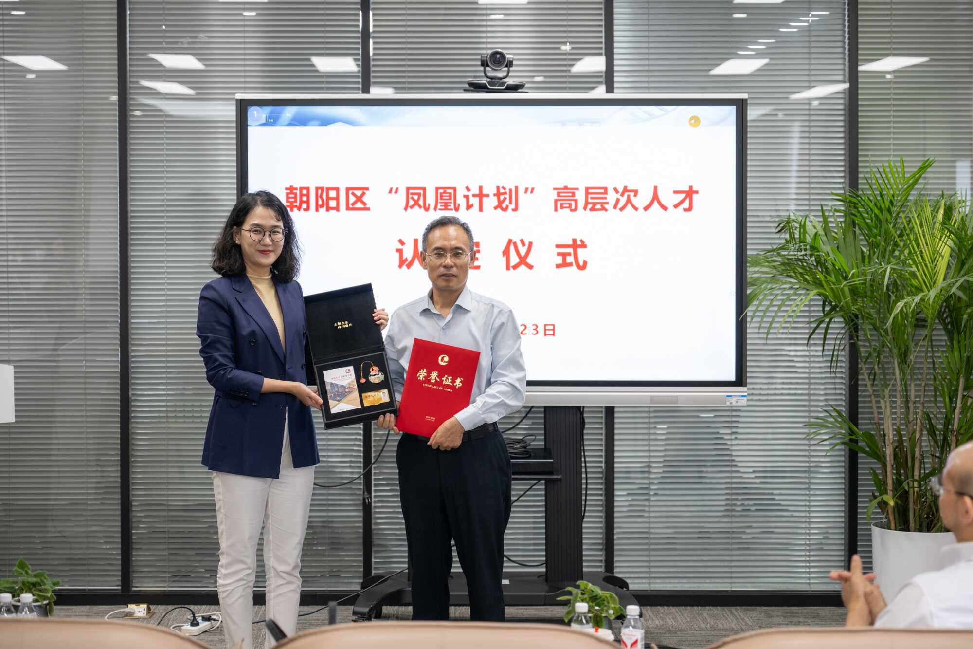 朝阳区人才工作局陈冰调研员为6位新认定高层次人才颁发荣誉证书和“凤凰人才卡”,详细介绍了朝阳区为“凤凰人才”精心打造的健康管理、交通出行、子女入学、住房保障、政务服务、文化休闲等“1+8”服务保障体系。