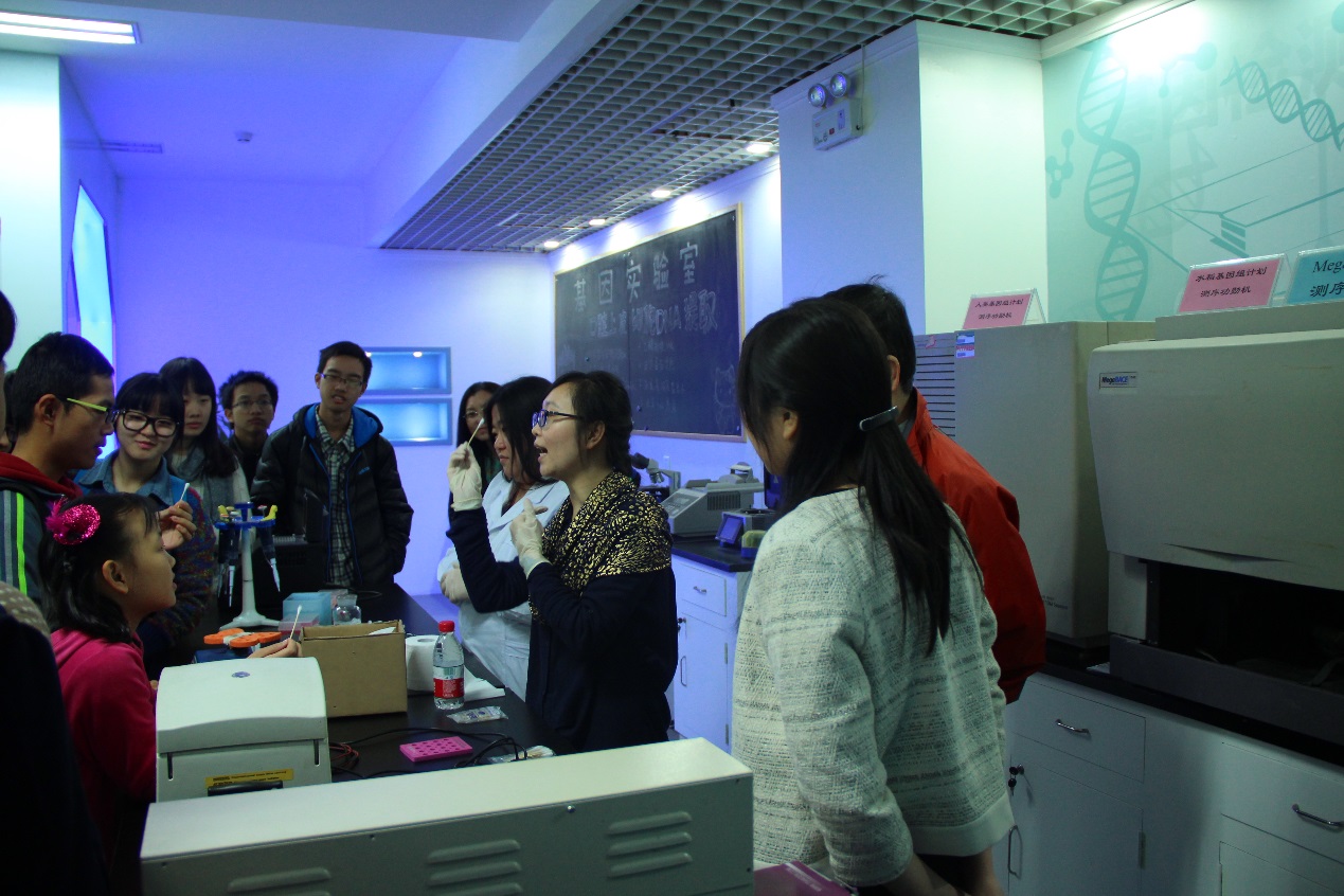 所团委书记、多米诺科普小组负责人徐磊以及科普小组的志愿者们分组带领同学们参观了基因组所高通量基因组测序实验室、高性能计算中心、课题组办公区及实验区,以及位于研究所十一楼的“基因科学与技术科普互动展厅”。在科普展厅内,同学们不仅看到了丰富有趣的科普展板、形象生动的科普动画,更与多米诺科普协会的实验员进行了DNA提取的互动实验,体验了一把实验的乐趣。