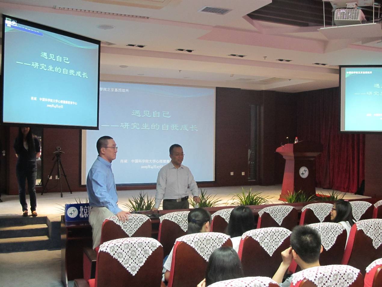 2015年4月27日下午,中国科学院大学心理健康教育中心主任肖斌老师在北京基因组研究所一楼报告厅给大家带来了这样一场与内心对话的自省之旅,“遇见自己——研究生的自我成长”。