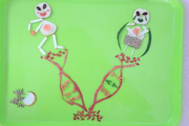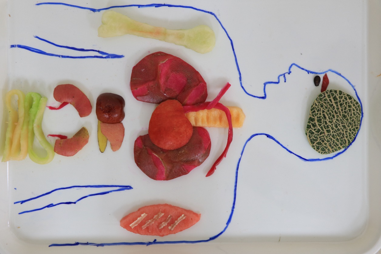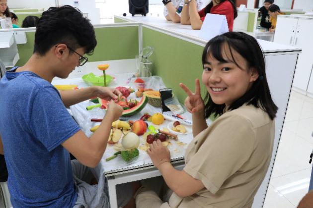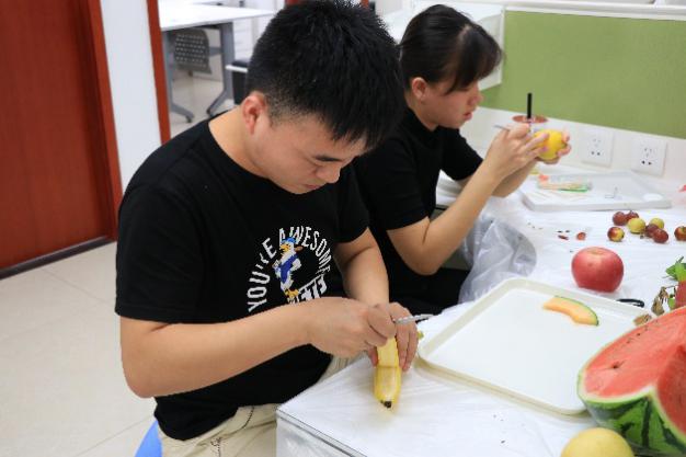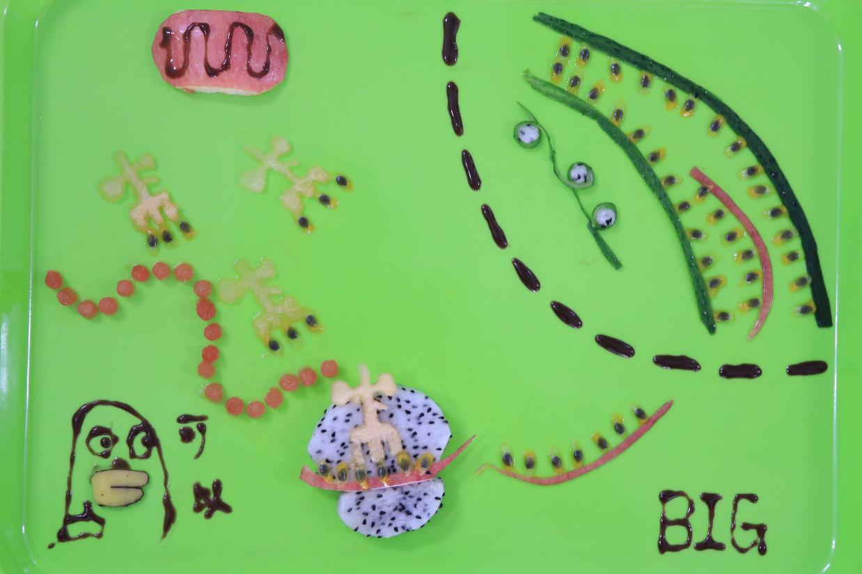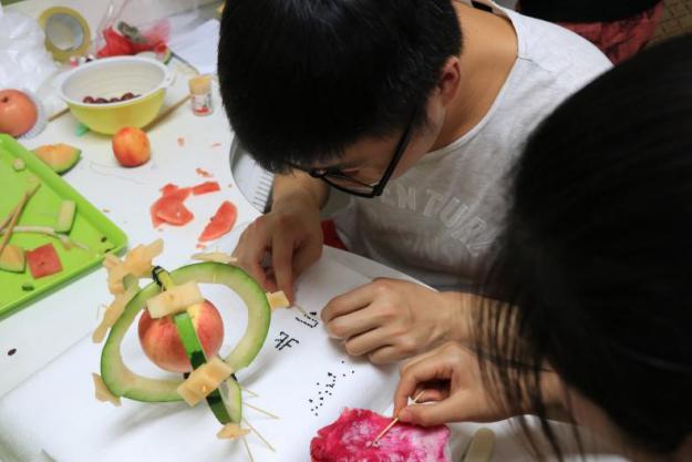 伴随着热身活动的结束,拼盘比赛正式开始。在限时一个小时内,各队绞尽脑汁,发挥团队想象能力,充分调动动手能力,生活中常见的水果在同学们手中变成了一个个独具科普创意的水果拼盘。